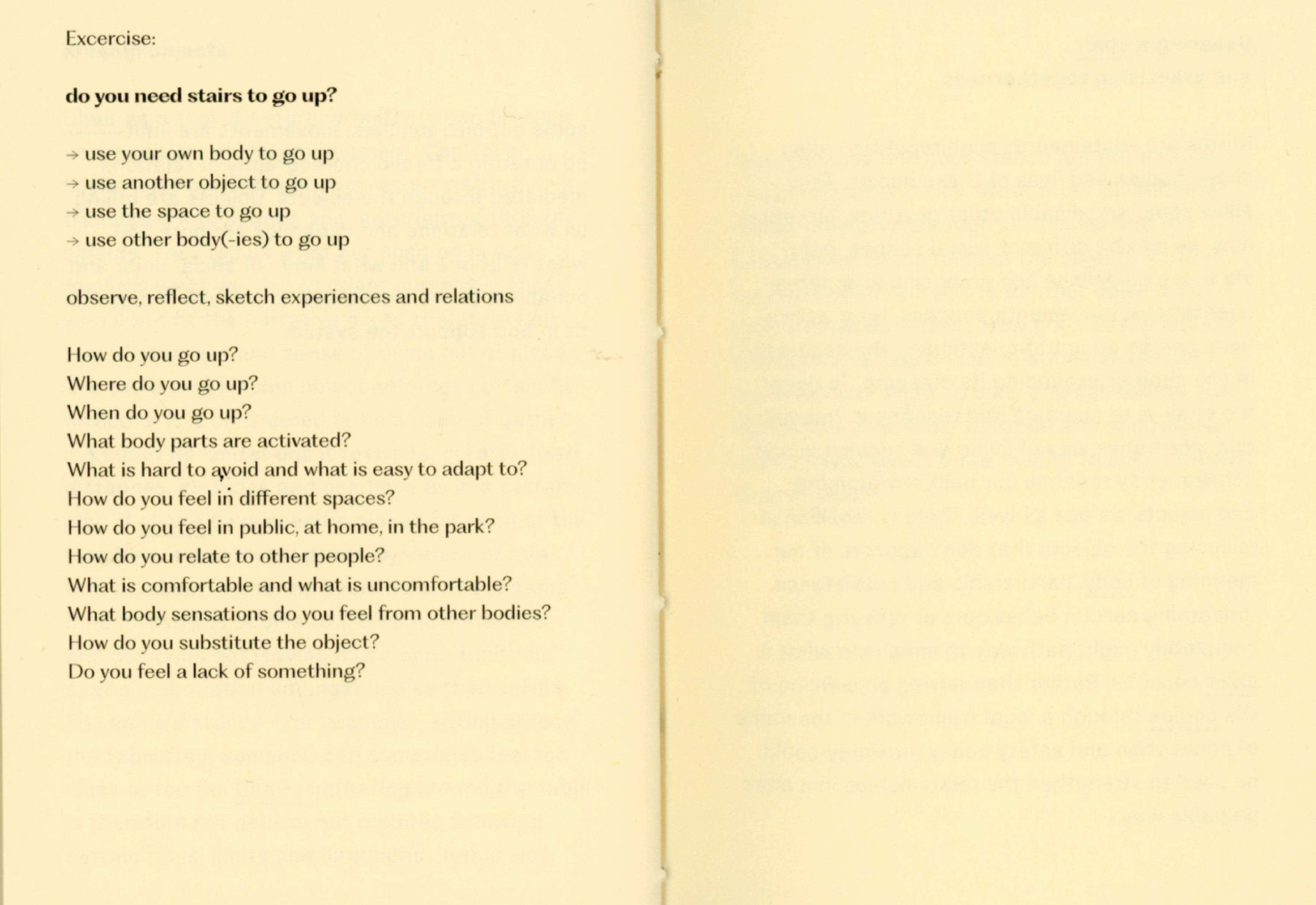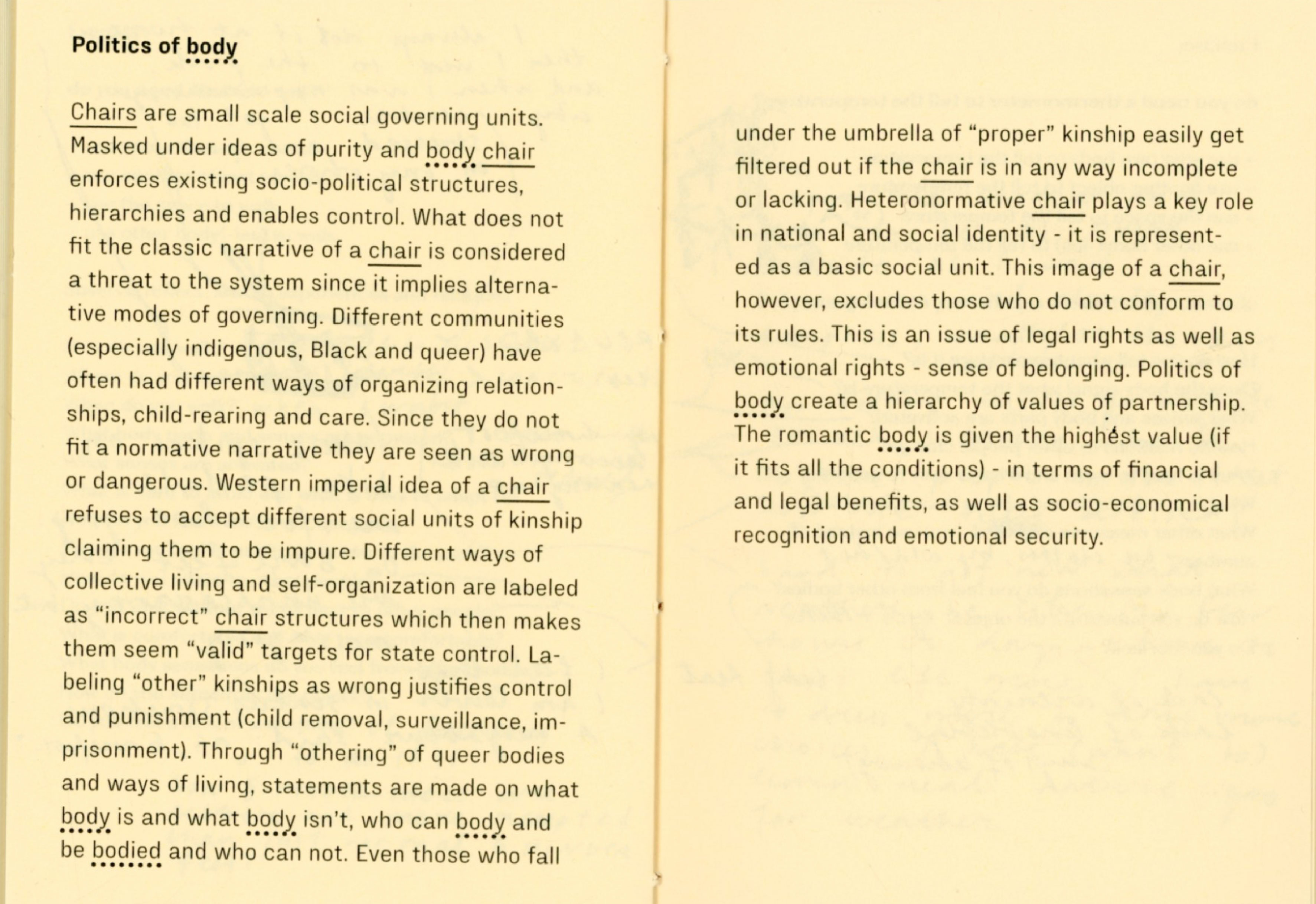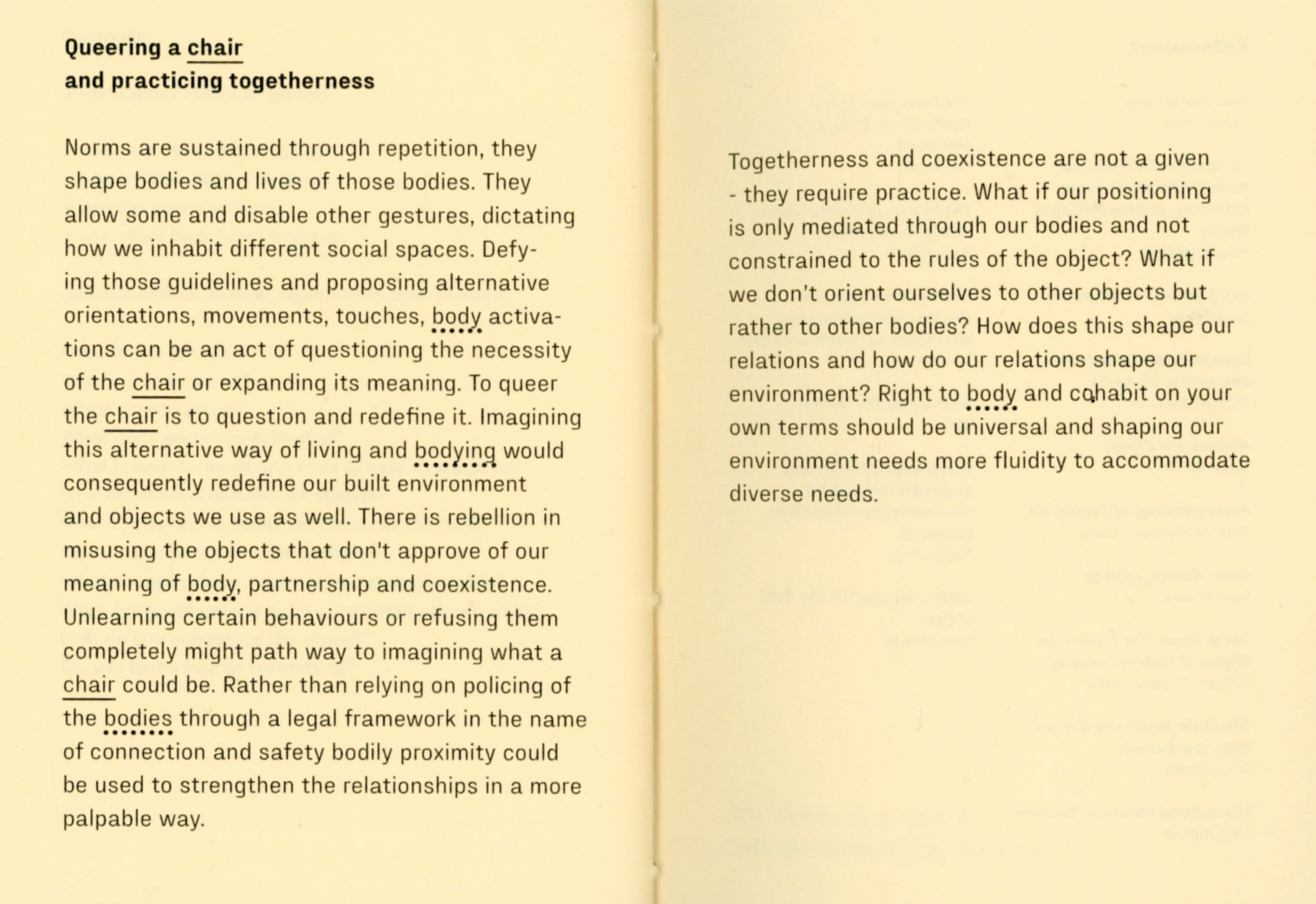 During my experiment I joined my friend designer Tana Jeić who was exploring how removing an object can create a sense of togetherness with other bodies, spontaniously without predefined directions. Our researches merged in the text "Do you need a ____ ? Excercises for exploring necessity" by questioning the necessity of a chair, a family, and the words themselves. We made a performative choreographed reading session inviting audience to participate in a collective chair excercise in the end. Excercises were meant for us as a research method, but now it is for you.