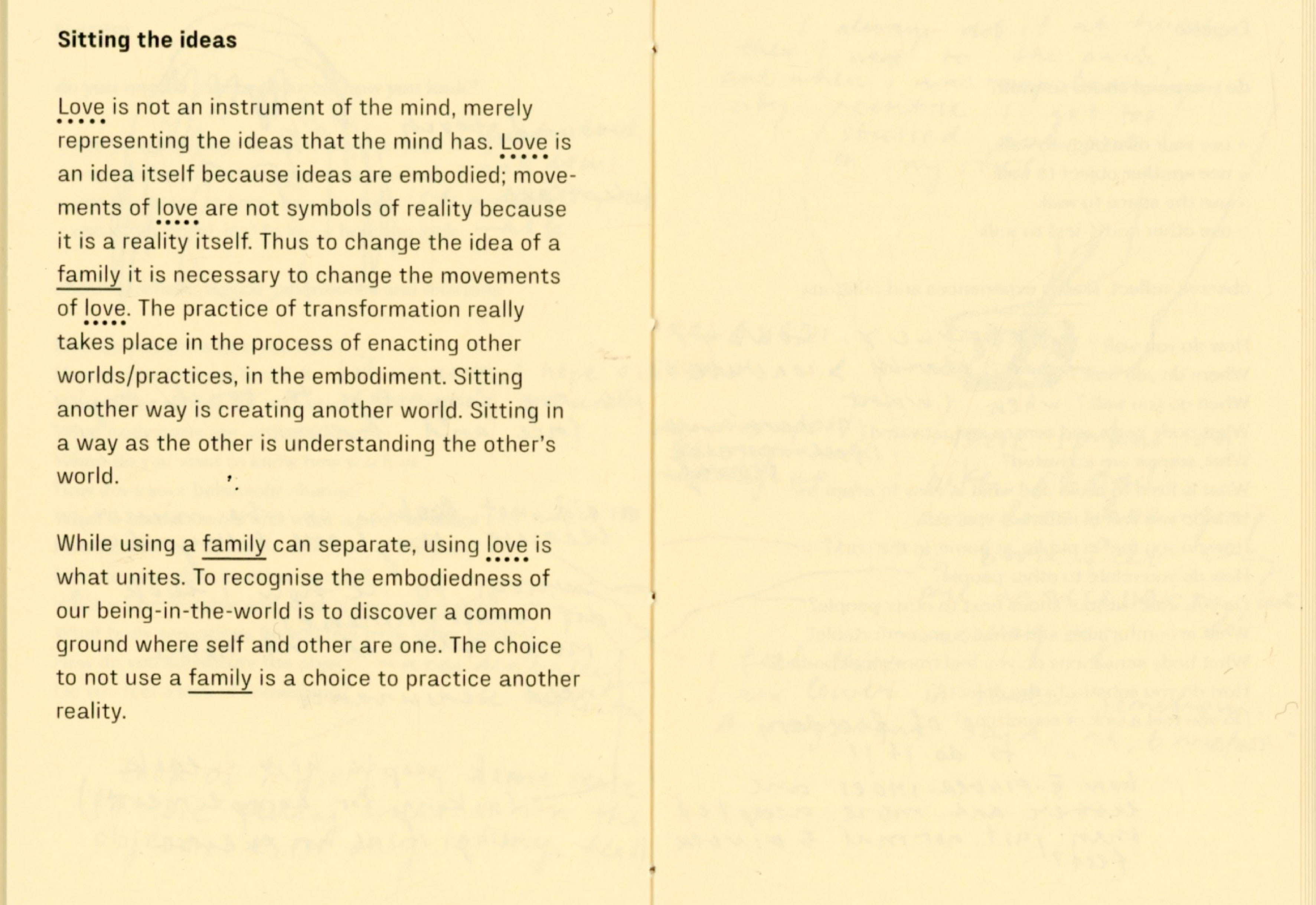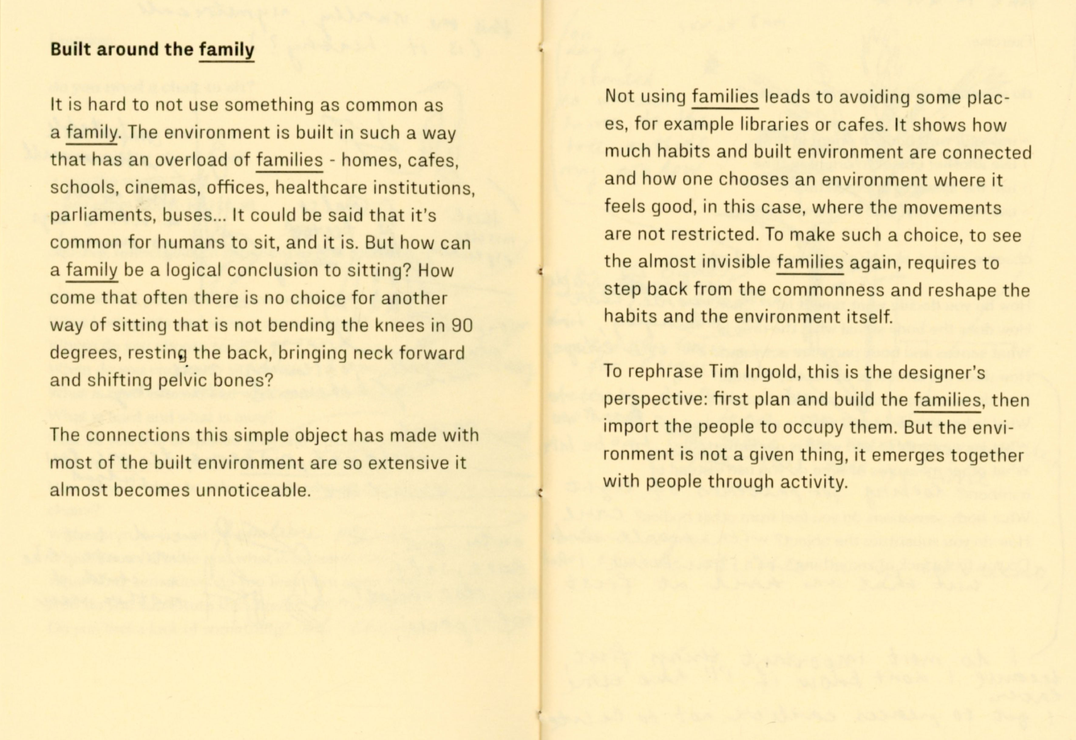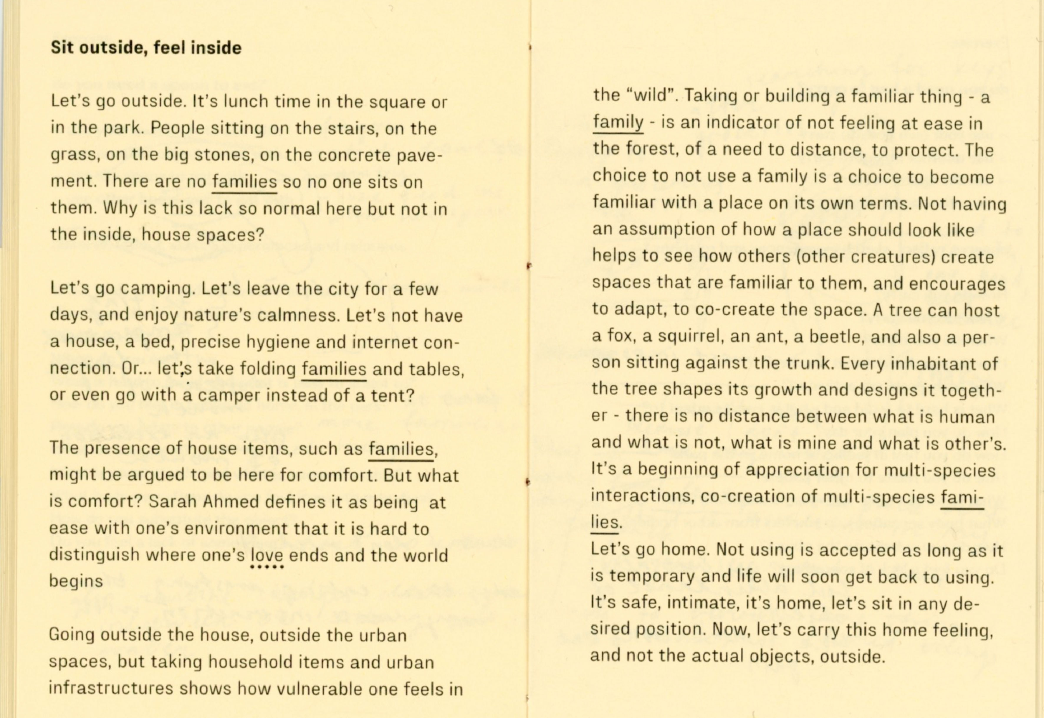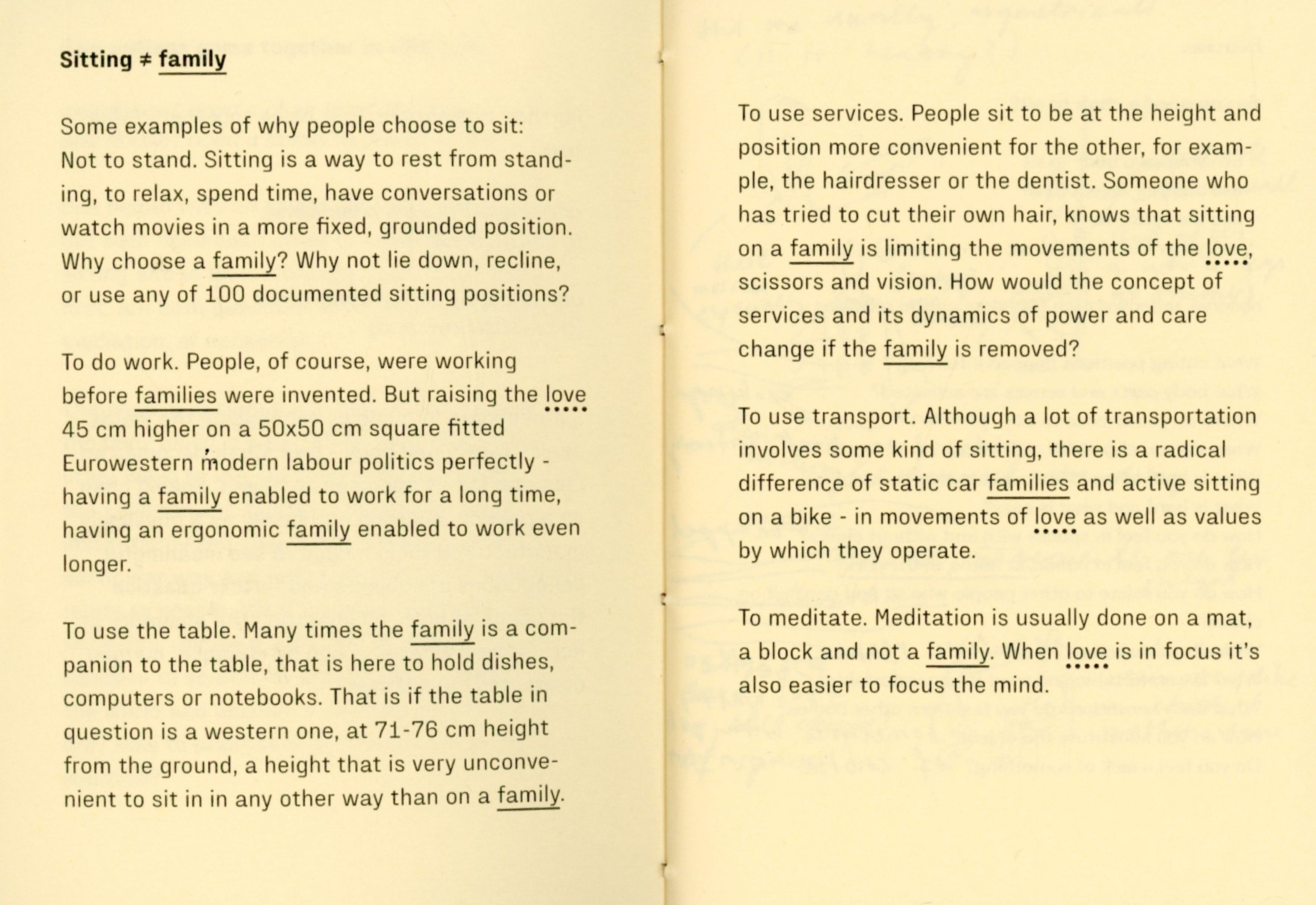 During my experiment I joined my friend designer Tana Jeić who was exploring how removing an object can create a sense of togetherness with other bodies, spontaniously without predefined directions. Our researches merged in the text "Do you need a ____ ? Excercises for exploring necessity" by questioning the necessity of a chair, a family, and the words themselves. We made a performative choreographed reading session inviting audience to participate in a collective chair excercise in the end. Excercises were meant for us as a research method, but now it is for you.