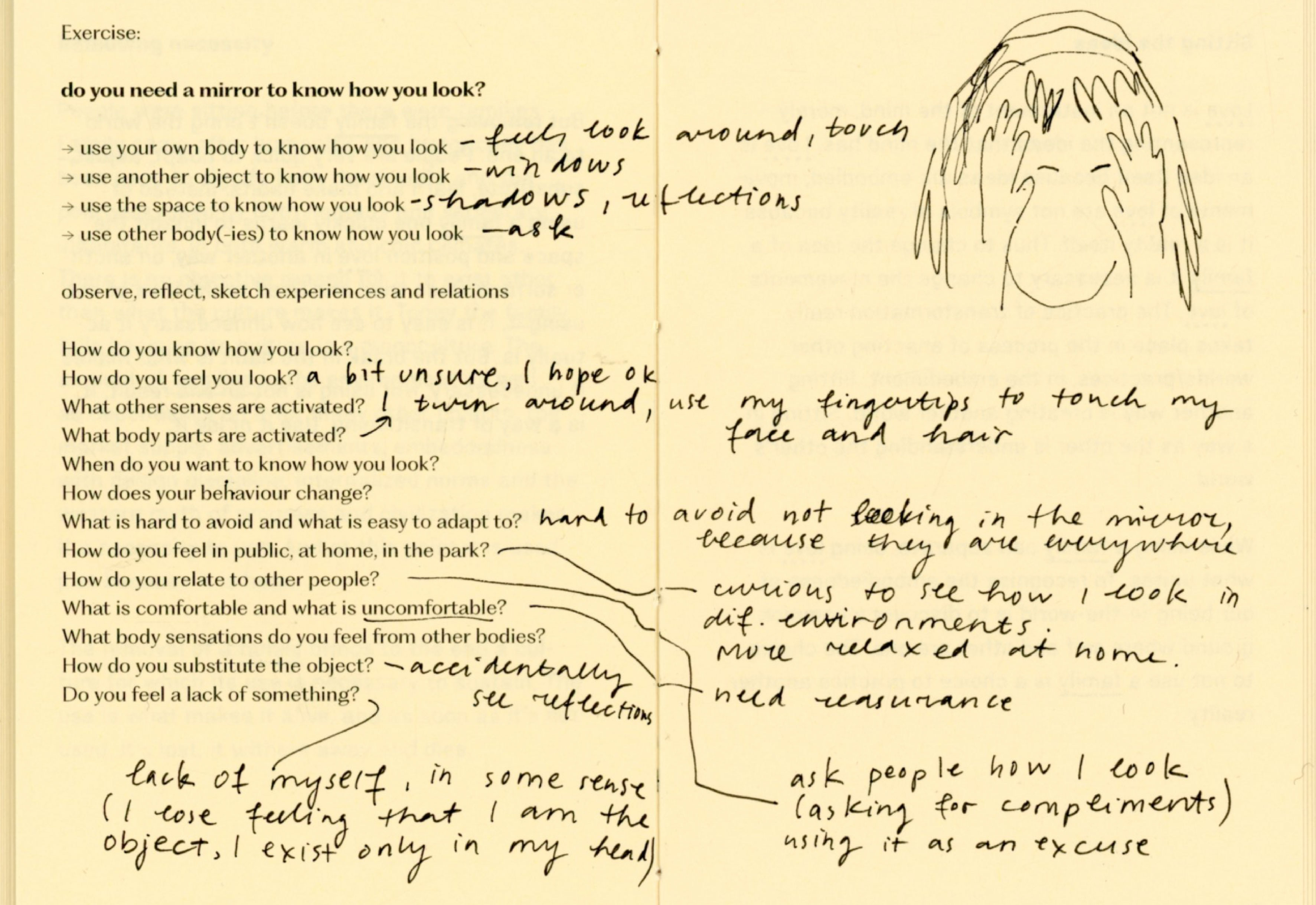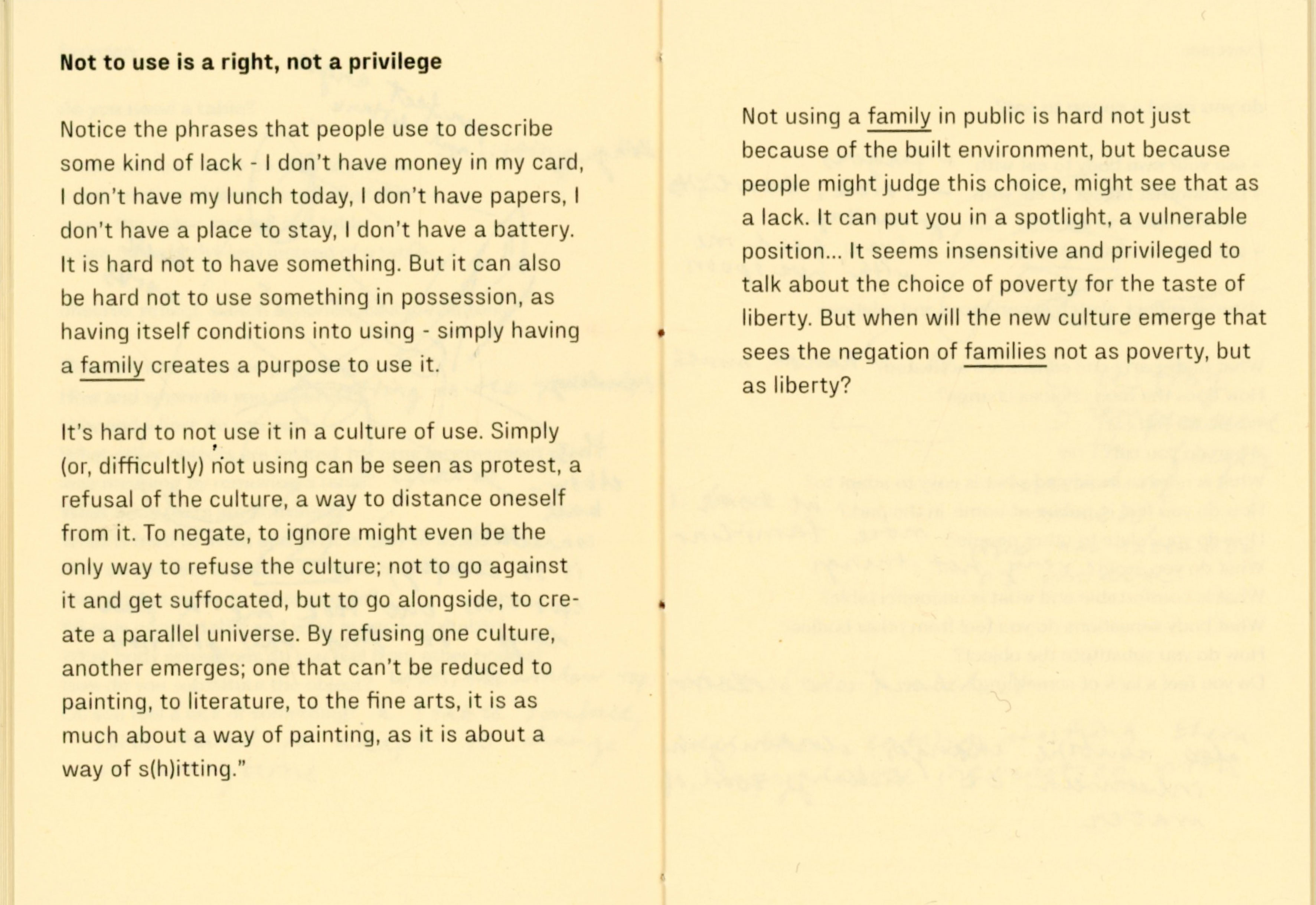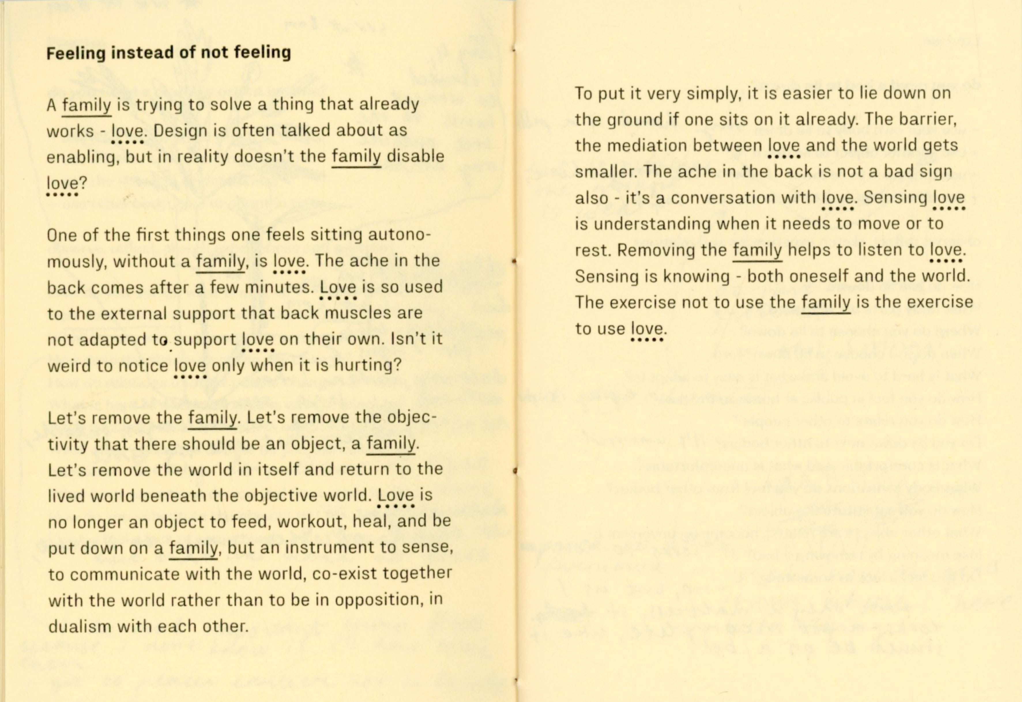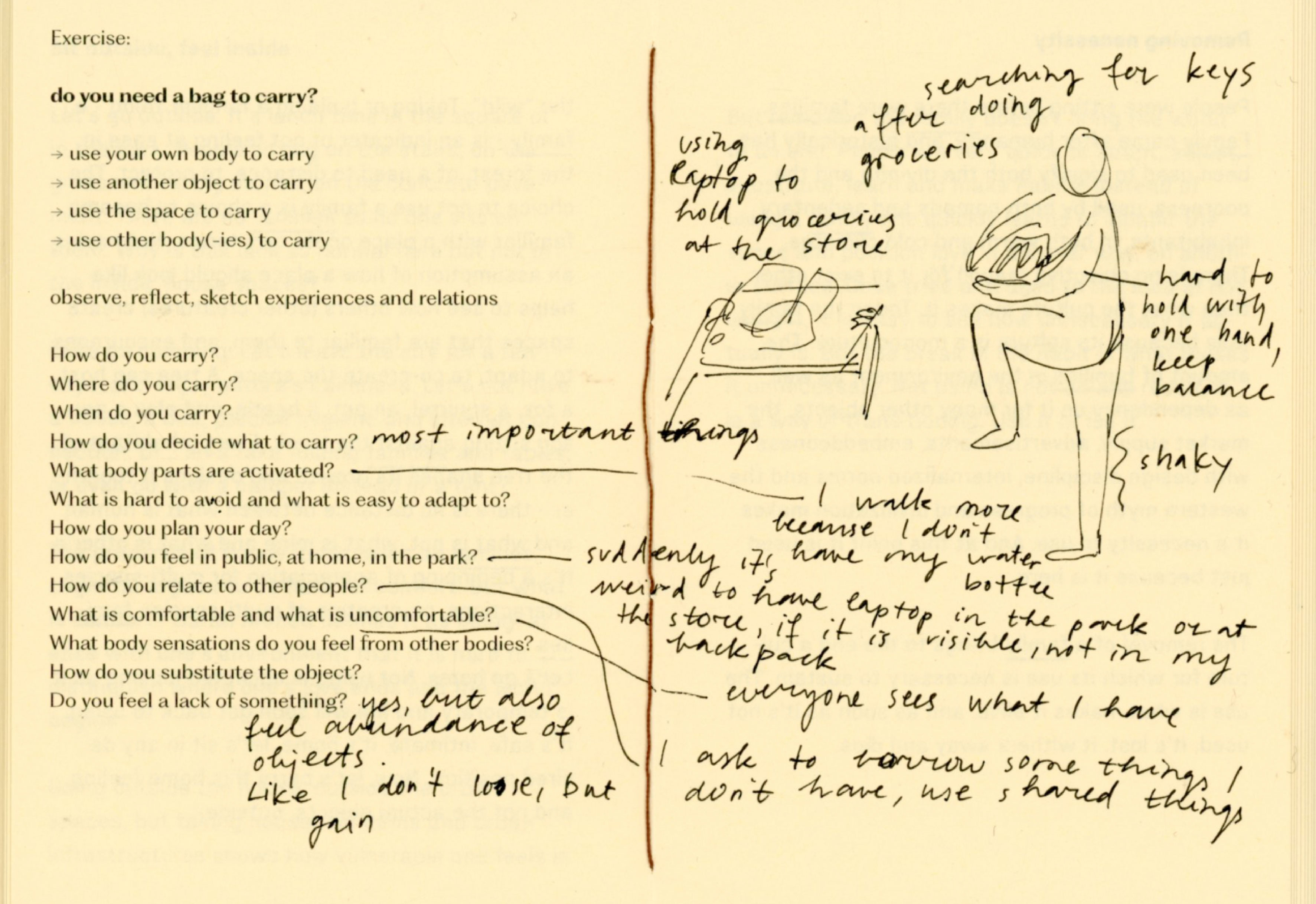 For a couple of weeks I experimented with not using a chair, a table, a bed, a bag, a clock, a thermometer, shoes, a spoon, a mirror. At times I felt trapped, foolish, uncomfortable, drawing attention, stressful, in need of replacement. At times I felt free, grounded, intimate, observant, social, strong, flexible. The important thing was, that I felt. So many things are mediated through design that in result erase body, senses, connections and choice.