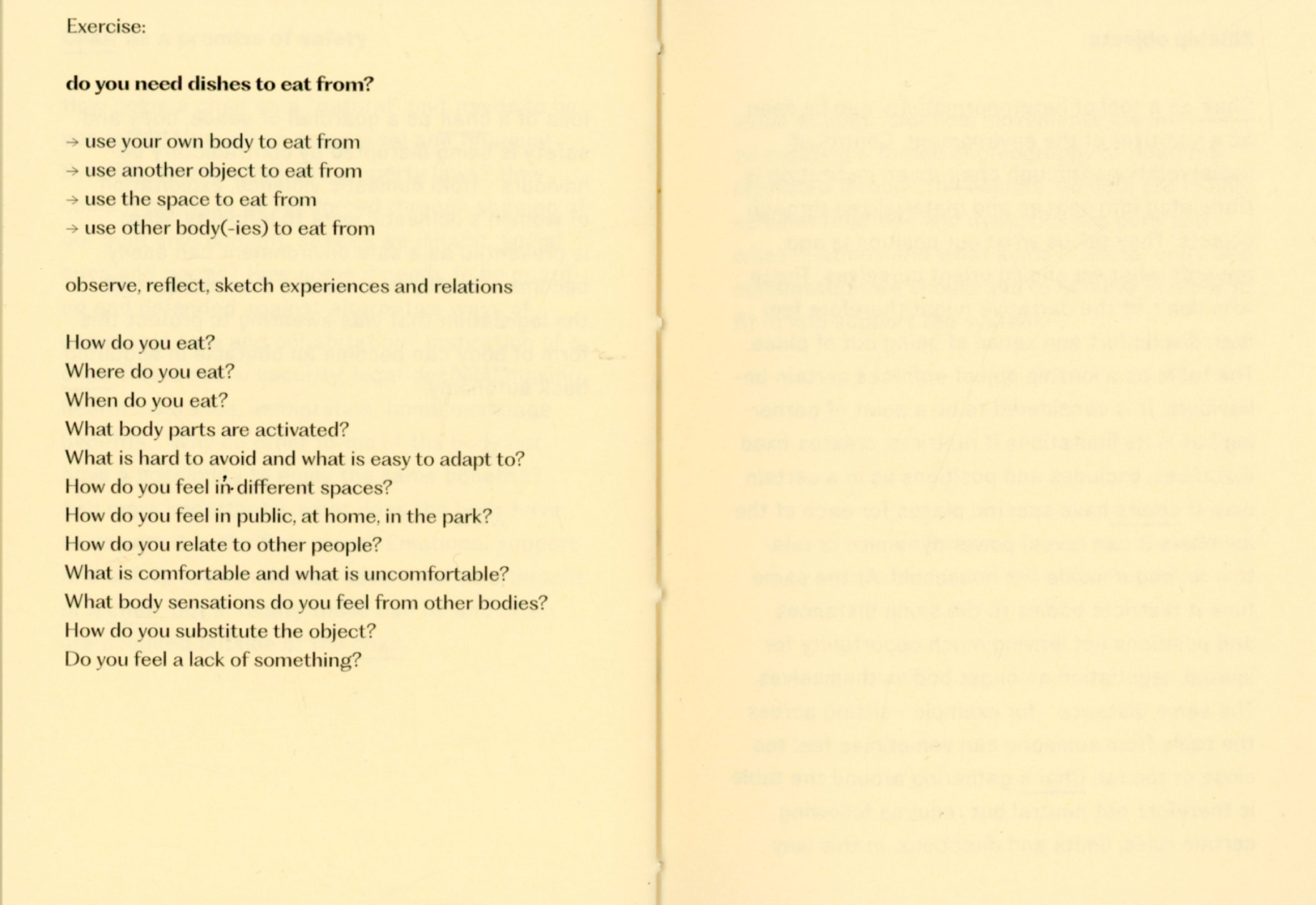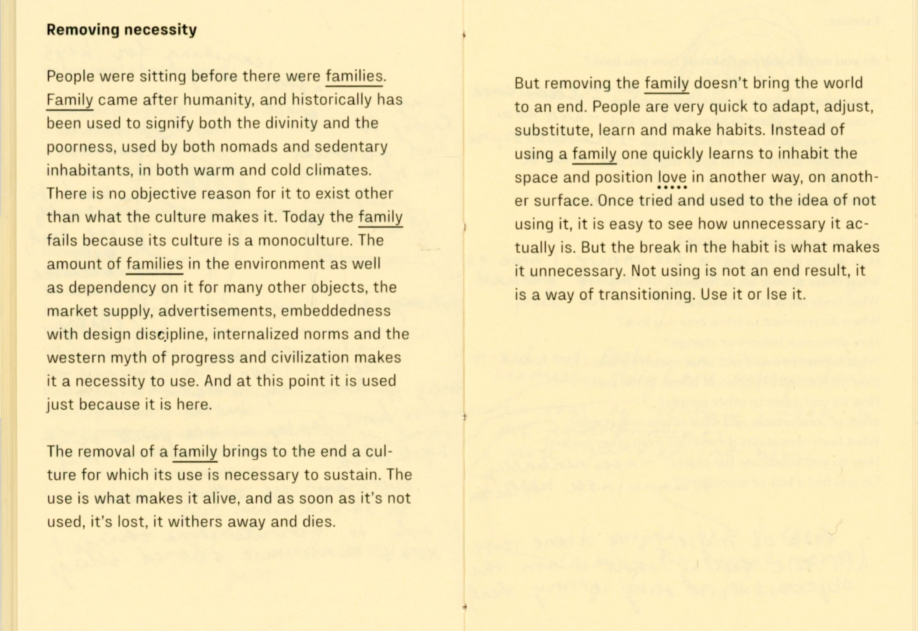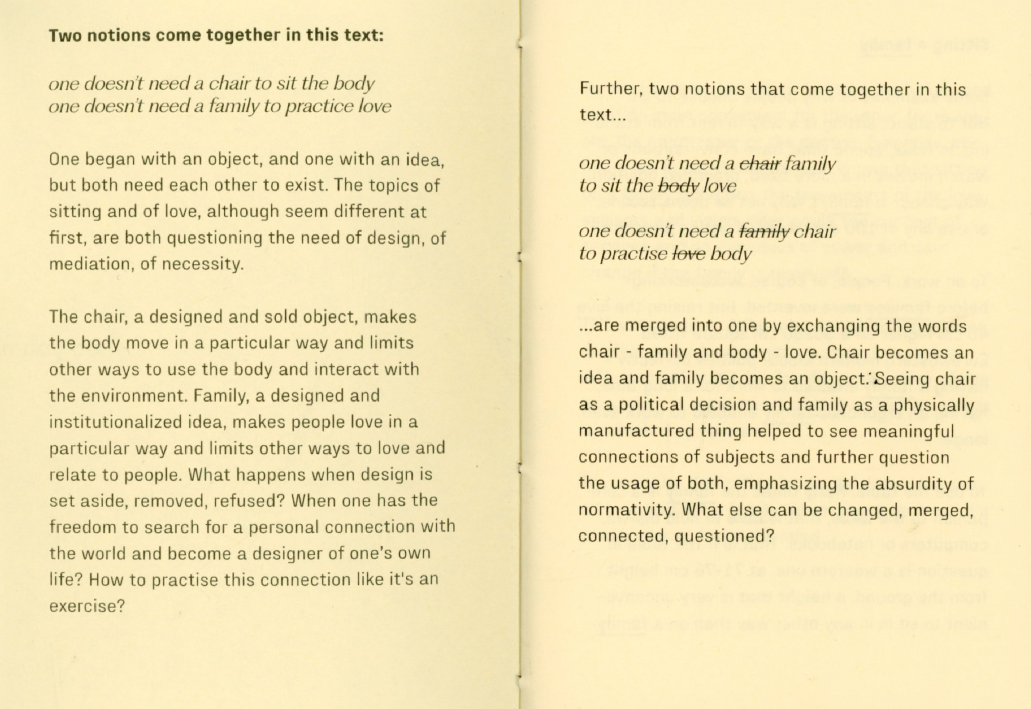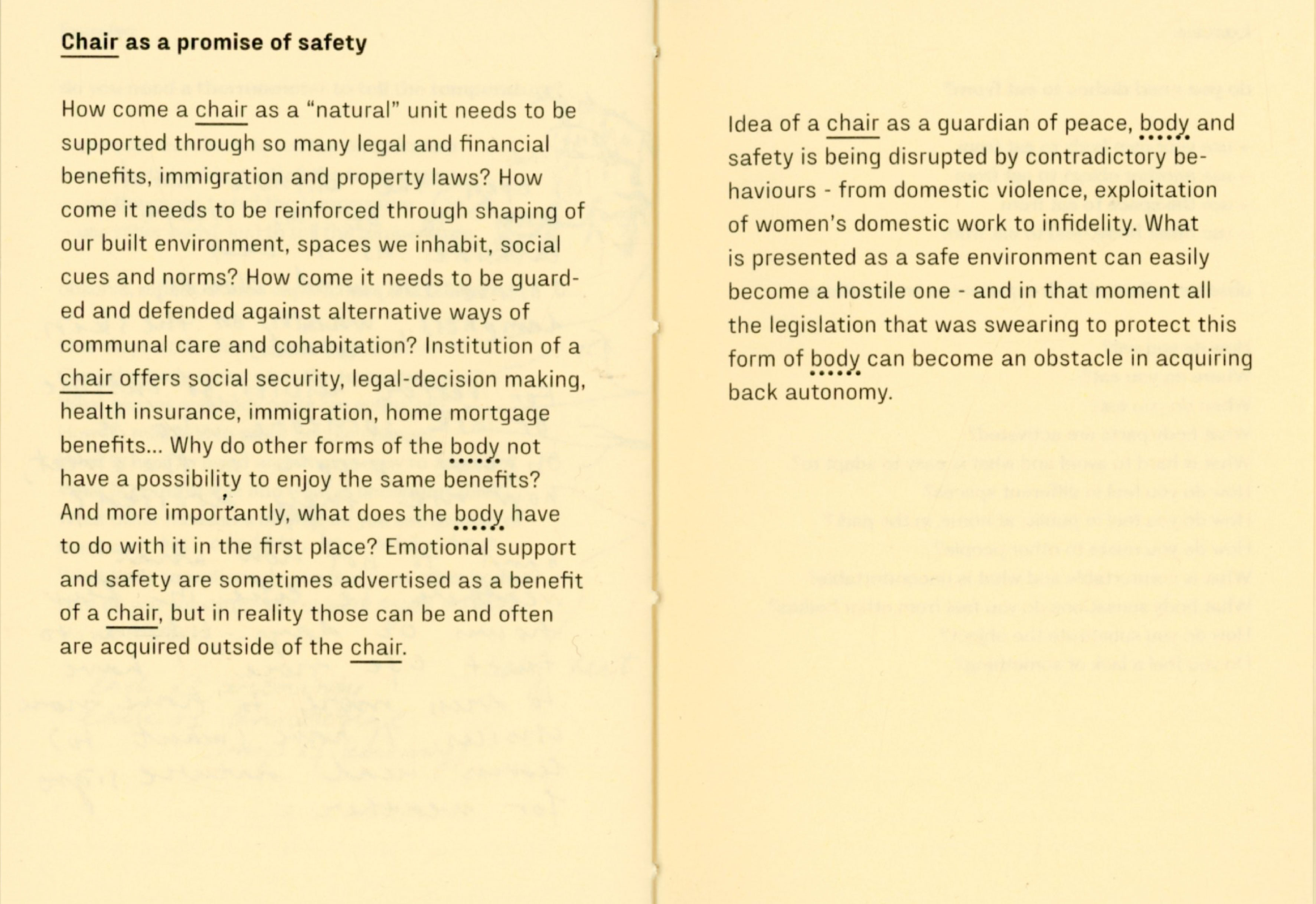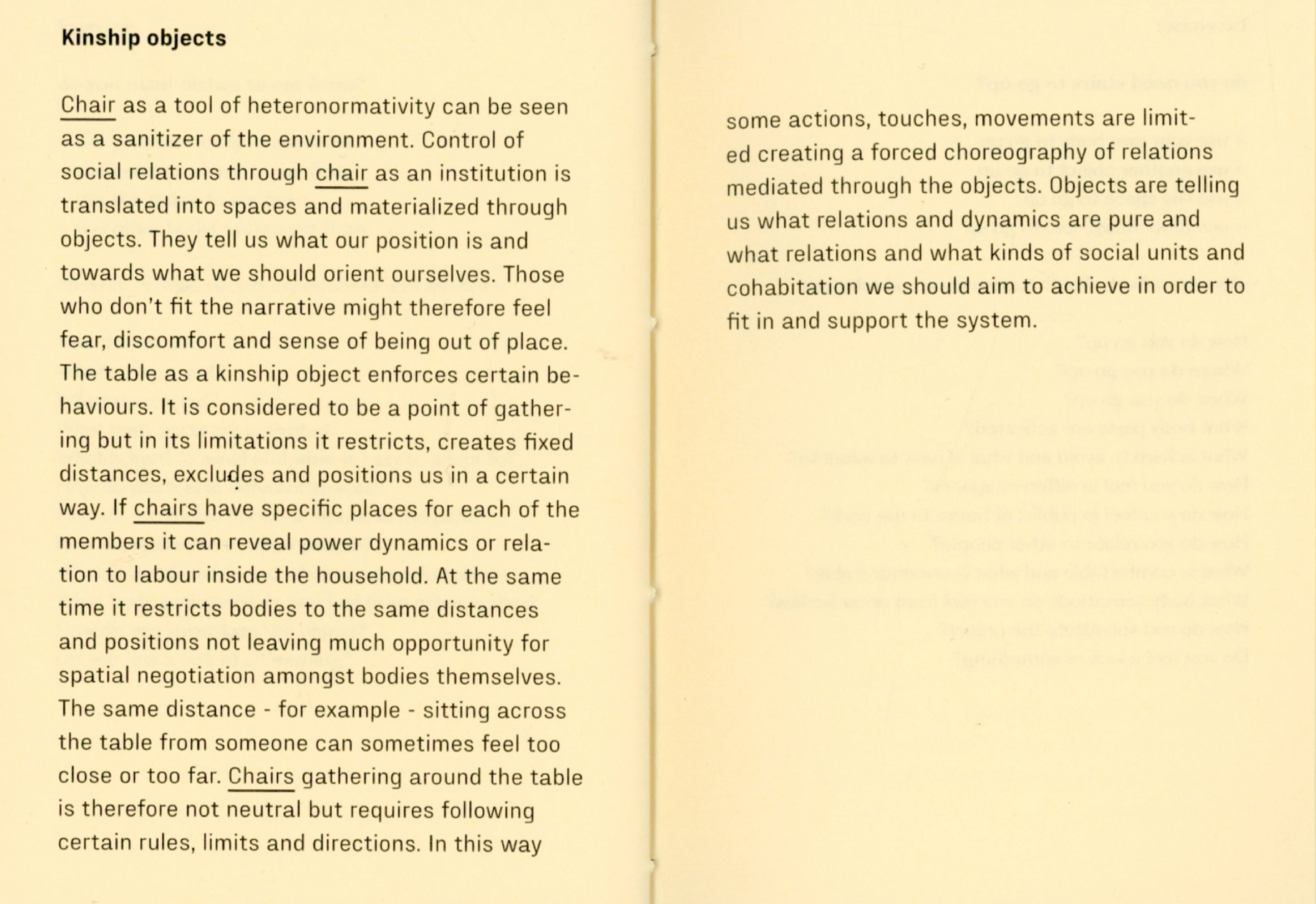 During my experiment I joined my friend designer Tana Jeić who was exploring how removing an object can create a sense of togetherness with other bodies, spontaniously without predefined directions. Our researches merged in the text "Do you need a ____ ? Excercises for exploring necessity" by questioning the necessity of a chair, a family, and the words themselves. We made a performative choreographed reading session inviting audience to participate in a collective chair excercise in the end. Excercises were meant for us as a research method, but now it is for you.