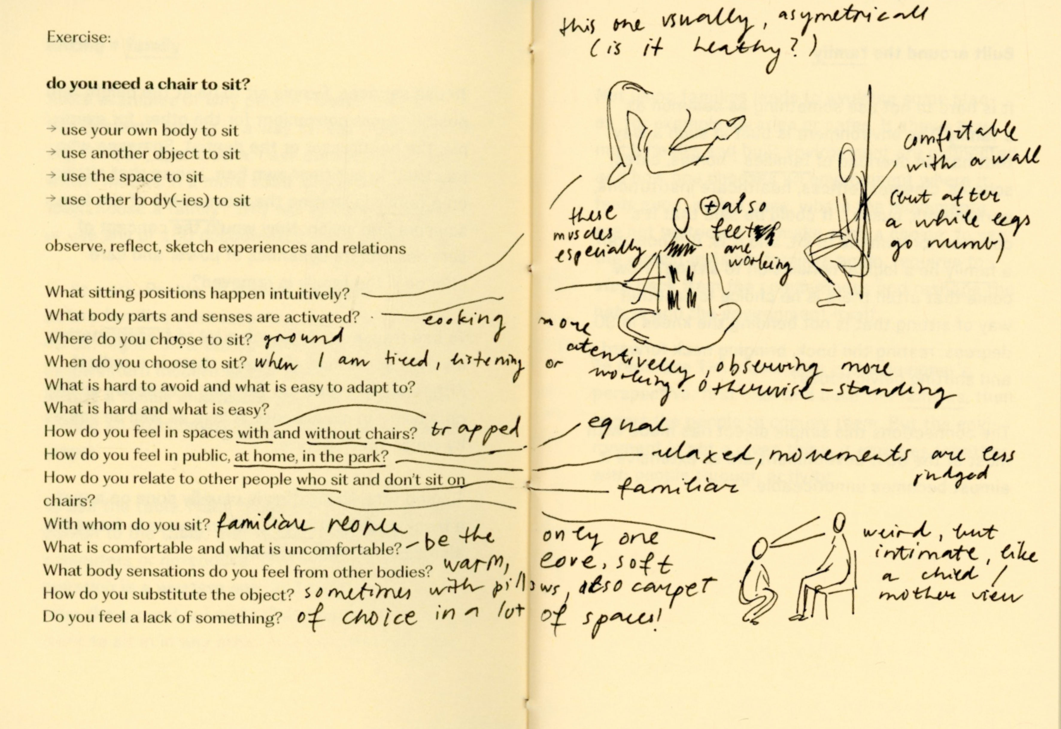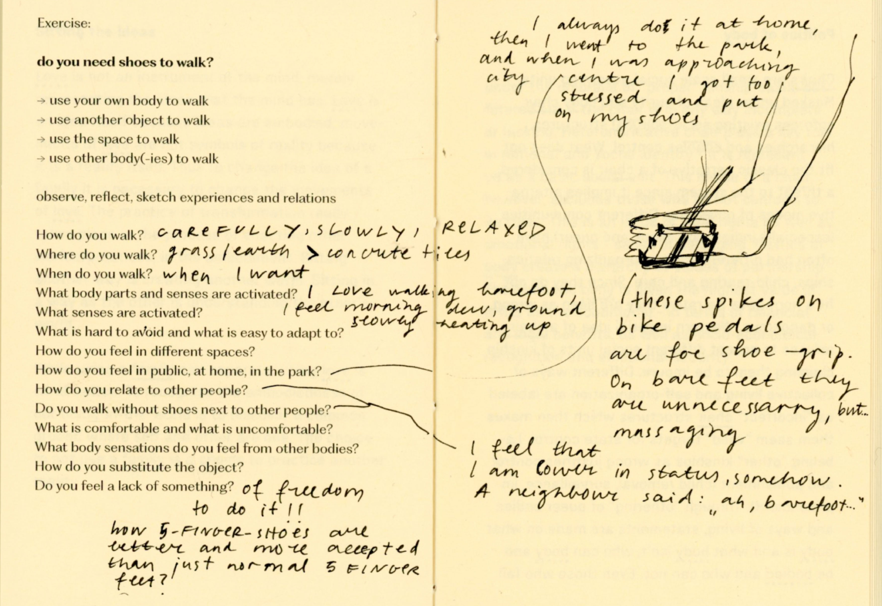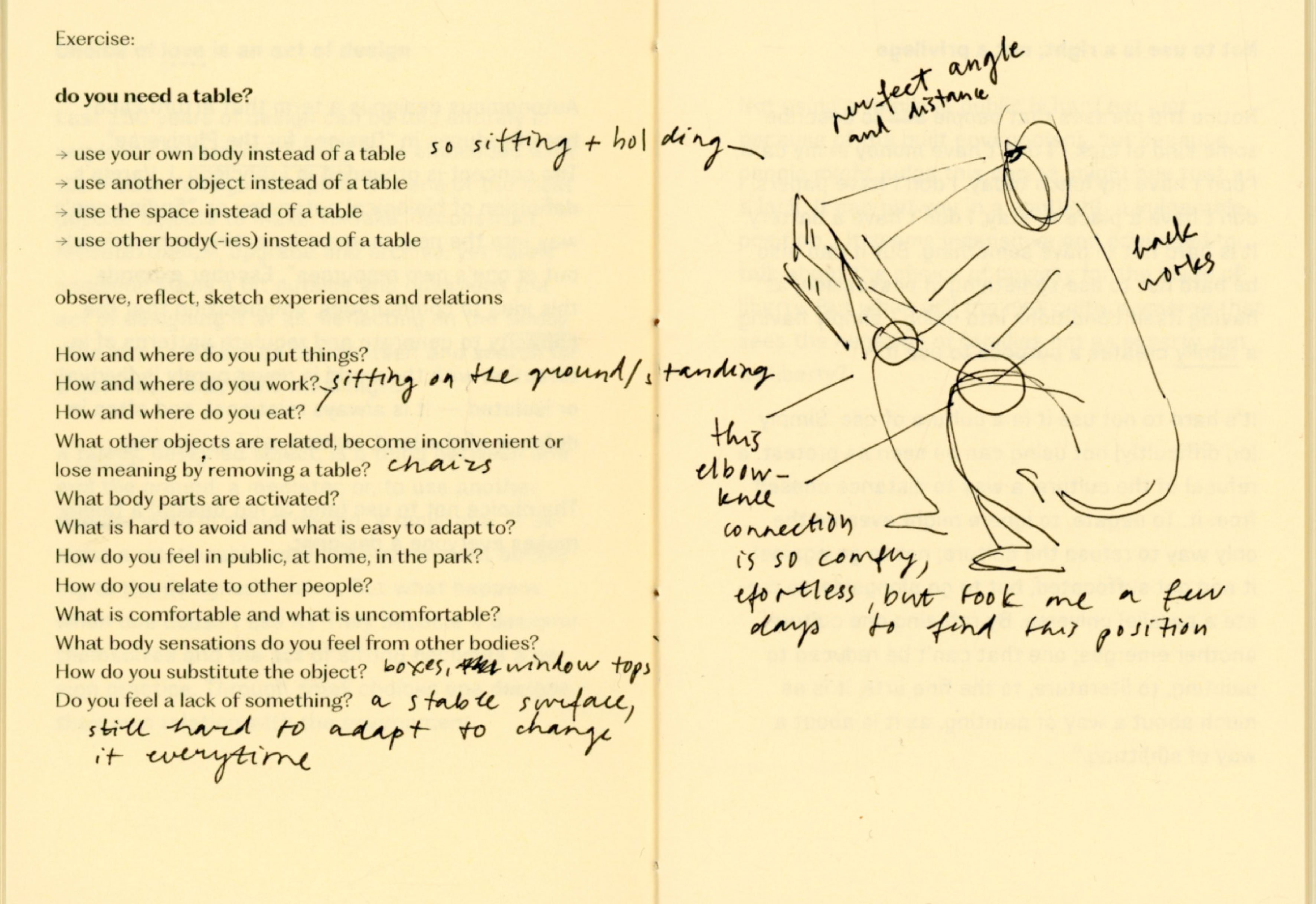 For a couple of weeks I experimented with not using a chair, a table, a bed, a bag, a clock, a thermometer, shoes, a spoon, a mirror. At times I felt trapped, foolish, uncomfortable, drawing attention, stressful, in need of replacement. At times I felt free, grounded, intimate, observant, social, strong, flexible. The important thing was, that I felt. So many things are mediated through design that in result erase body, senses, connections and choice.