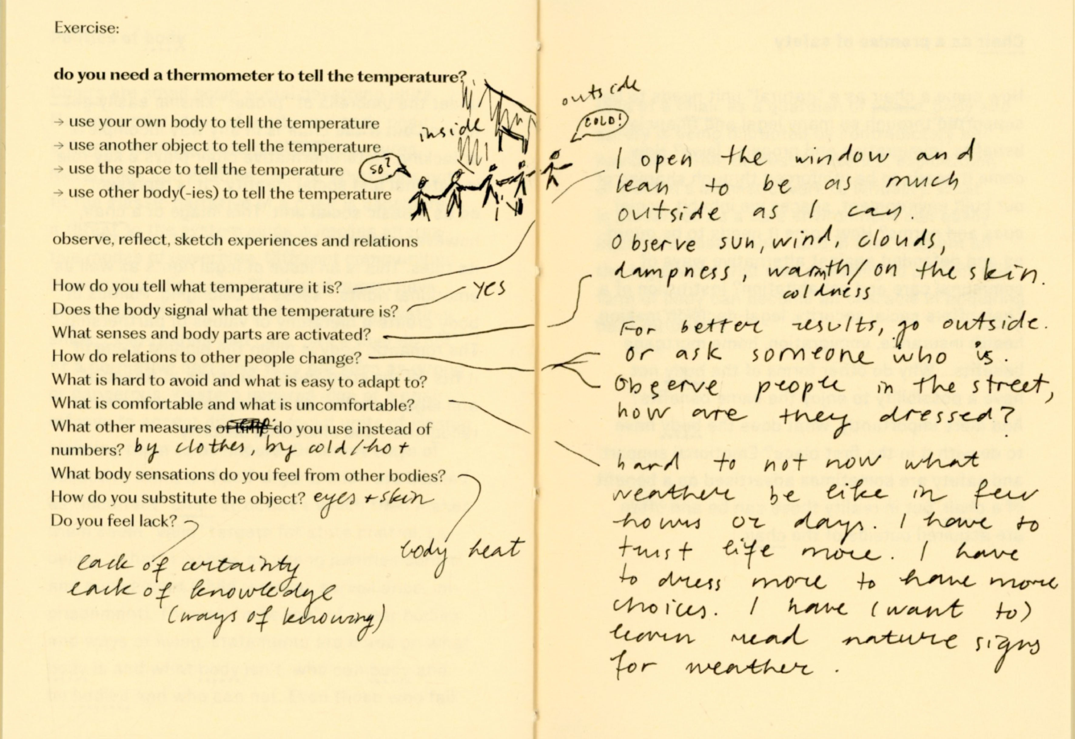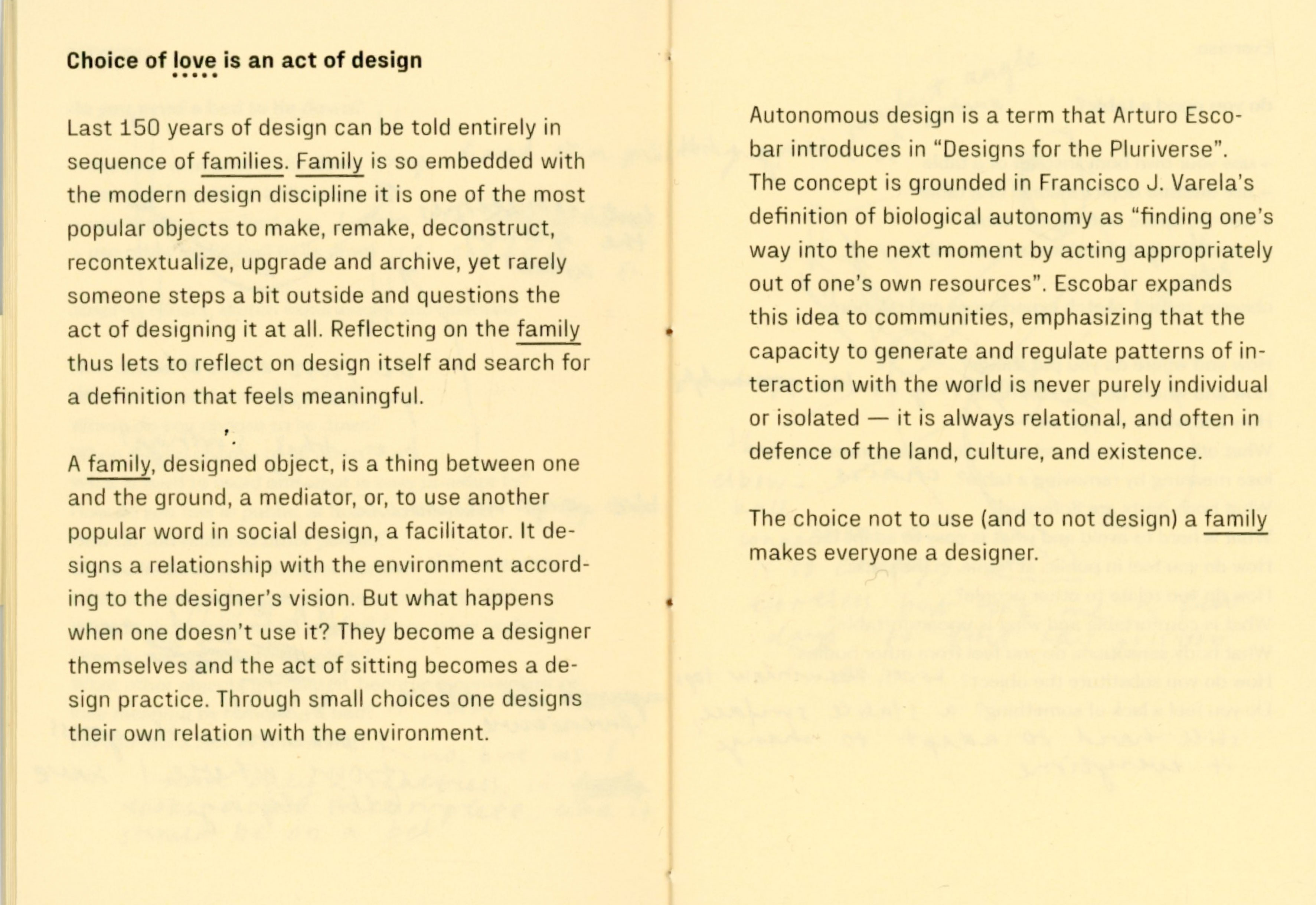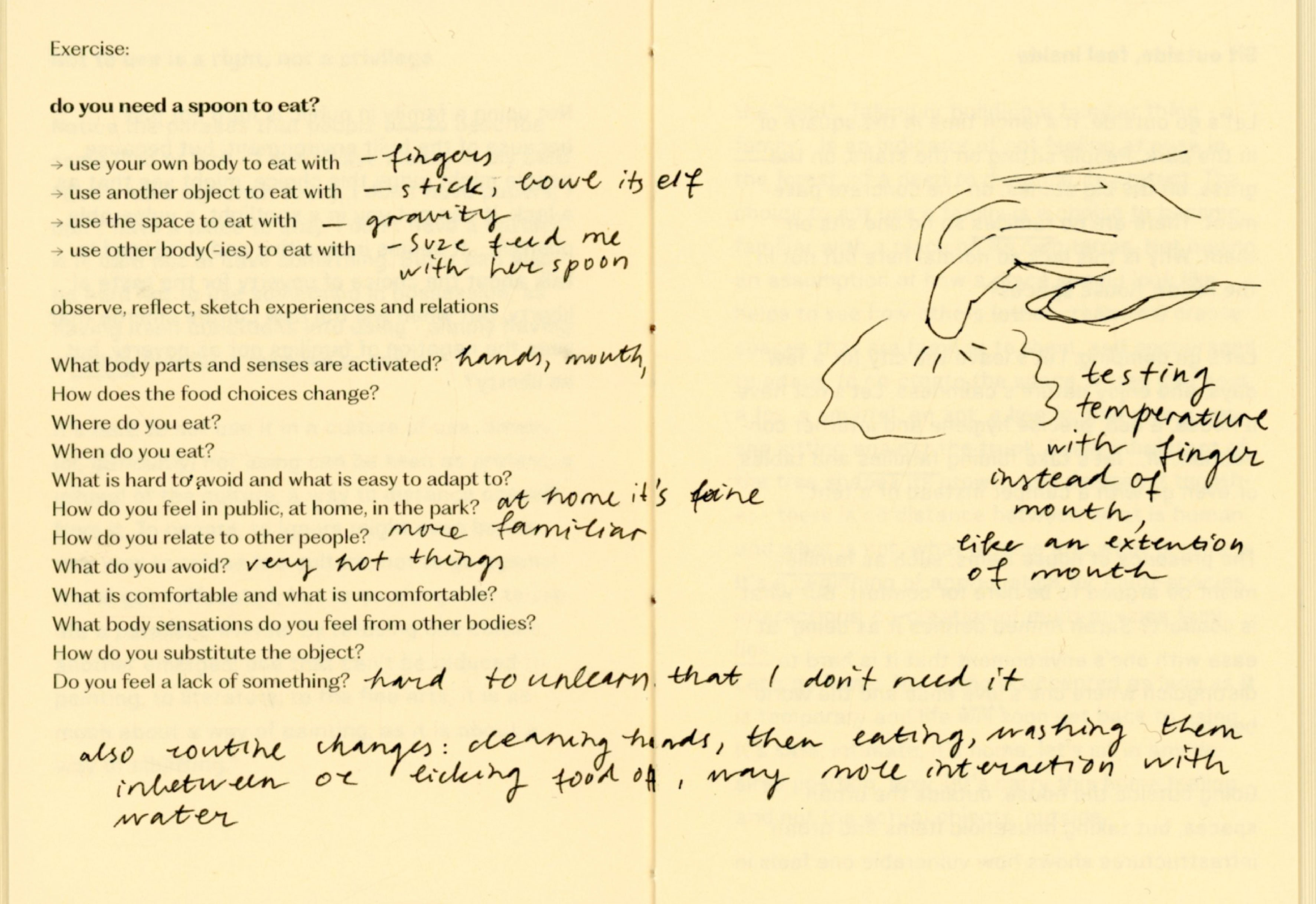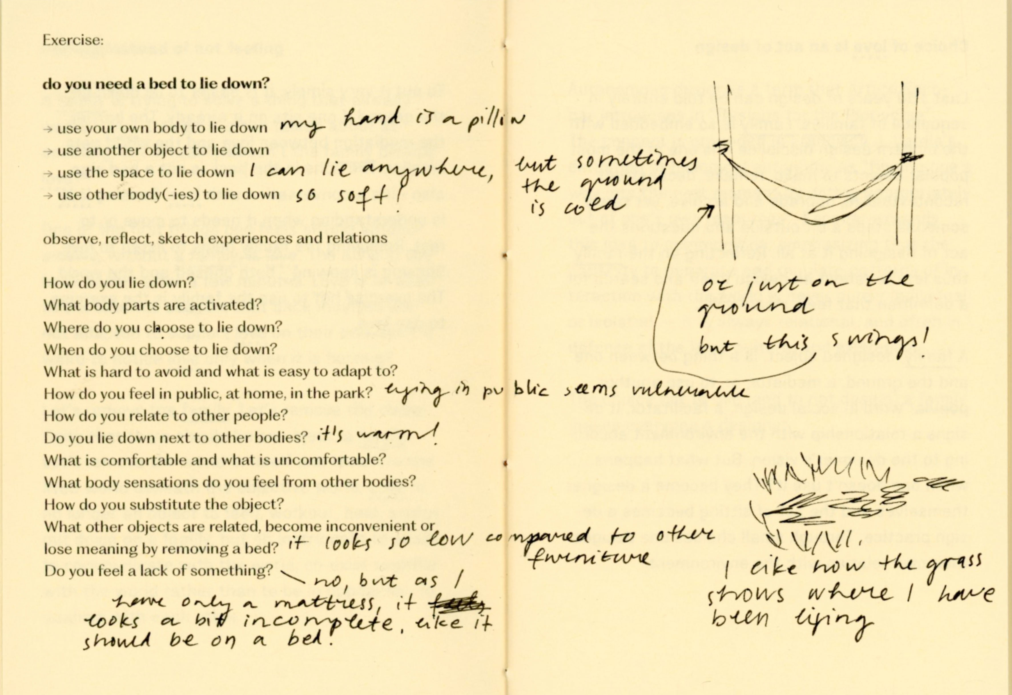 For a couple of weeks I experimented with not using a chair, a table, a bed, a bag, a clock, a thermometer, shoes, a spoon, a mirror. At times I felt trapped, foolish, uncomfortable, drawing attention, stressful, in need of replacement. At times I felt free, grounded, intimate, observant, social, strong, flexible. The important thing was, that I felt. So many things are mediated through design that in result erase body, senses, connections and choice.